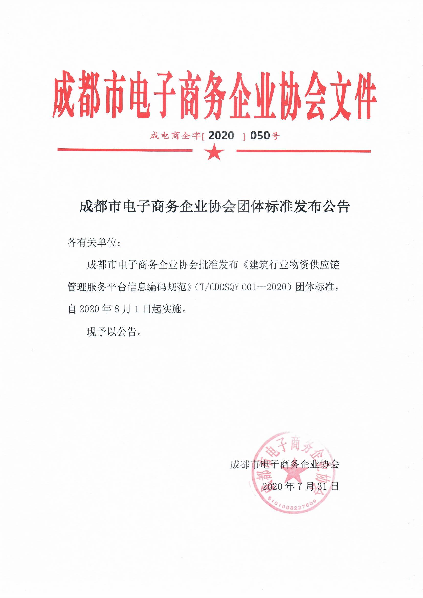 成都市电子商务企业协会批准发布《建筑行业物资供应链管理服务平台信息编码规范》(T/CDDSQY 001—2020)团体标准,自2020年8月1日起实施。