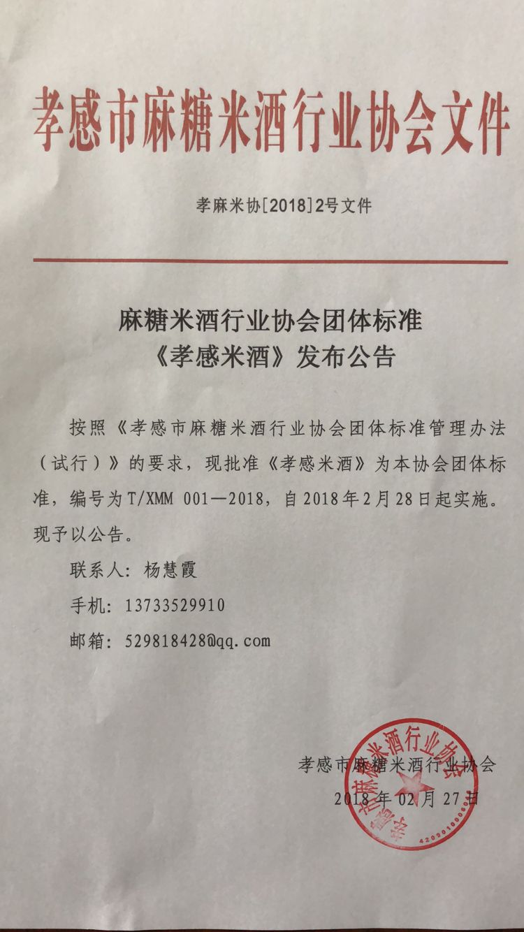 按照《孝感市麻糖米酒行业协会团体标准管理办法(试行)》的要求,现批准《孝感米酒》为本协会团体标准,编号为T/XMM 001—2018,自2018年2月28日起实施。现予以公告。