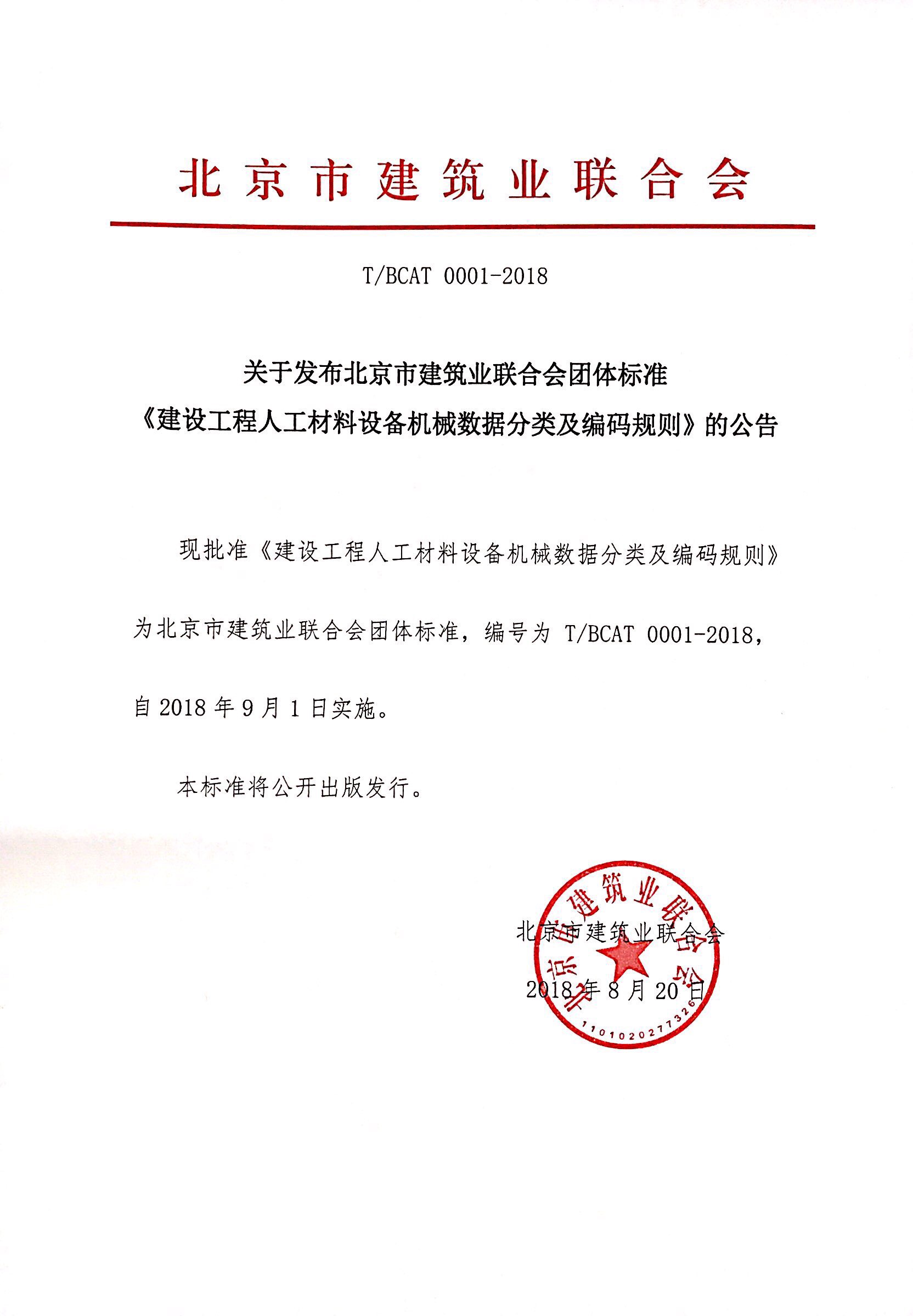 现批准《建设工程人工材料设备机械数据分类及编码规则》为北京市建筑业联合会团体标准,编号为T/BCAT 0001-2018,自2018年9月1日实施。
