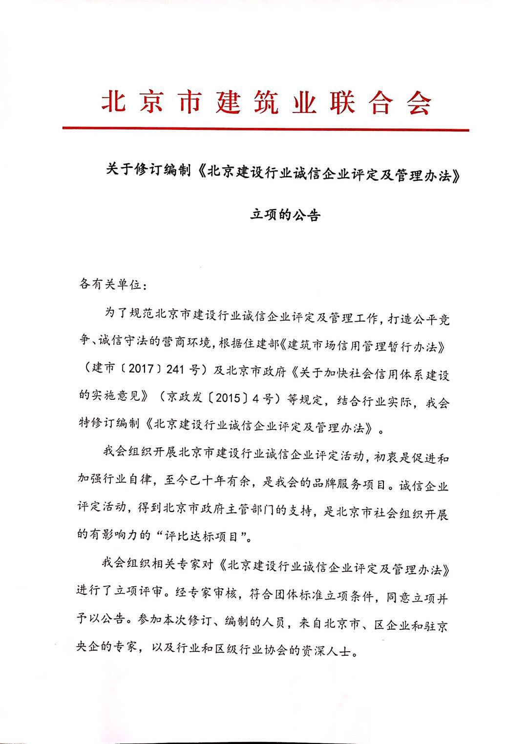 我会组织相关专家对《北京建设行业诚信企业评定及管理办法》进行了立项评审。经专家审核,符合团体标准立项条件,同意立项并予以公告。参加本次修订、编制的人员,来自北京市、区企业和驻京央企的专家,以及行业和区级行业协会的资深人士。