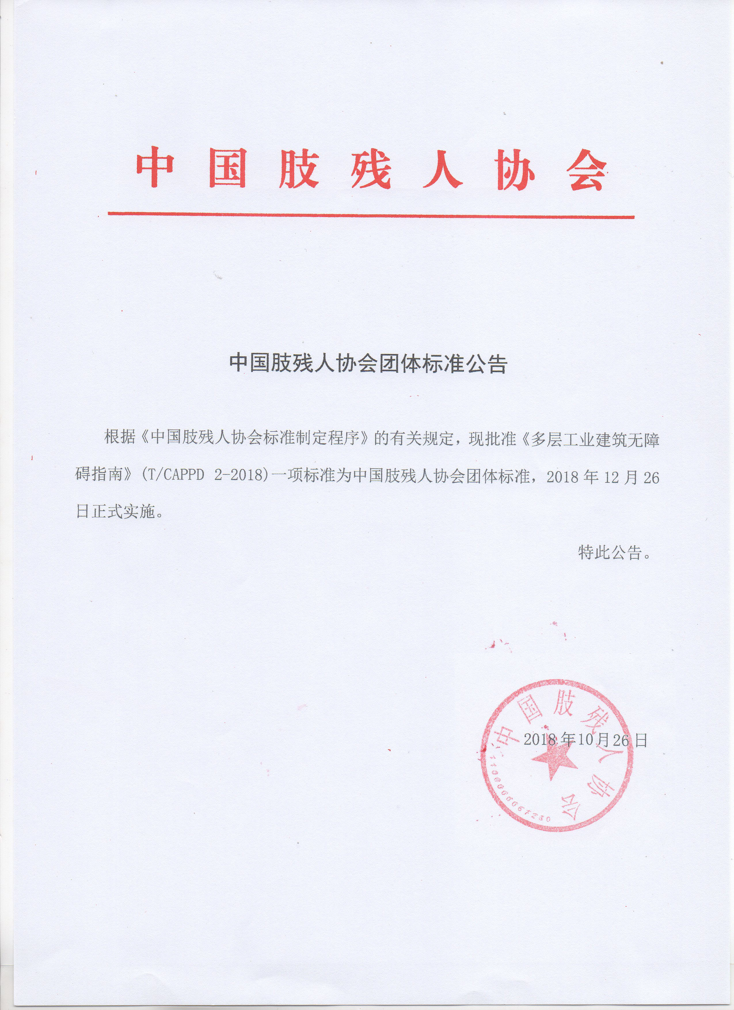 根据《中国肢残人协会标准制定程序》的有关规定,现批准《多层工业建筑无障碍指南》(T/CAPPD 2—2018)一项标准为中国肢残人协会团体标准,2018年12月26日正式实施。