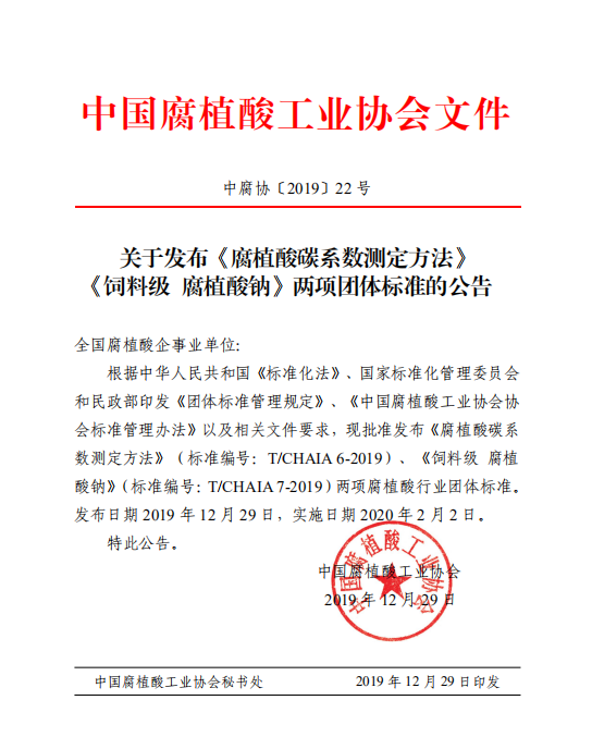 根据中华人民共和国《标准化法》、国家标准化管理委员会和民政部印发《团体标准管理规定》、《中国腐植酸工业协会协会标准管理办法》以及相关文件要求,现批准发布《腐植酸碳系数测定方法》(标准编号:T/CHAIA 6-2019)、《饲料级 腐植酸钠》(标准编号:T/CHAIA 7-2019)两项腐植酸行业团体标准。发布日期2019年12月29日,实施日期2020年2月2日。
