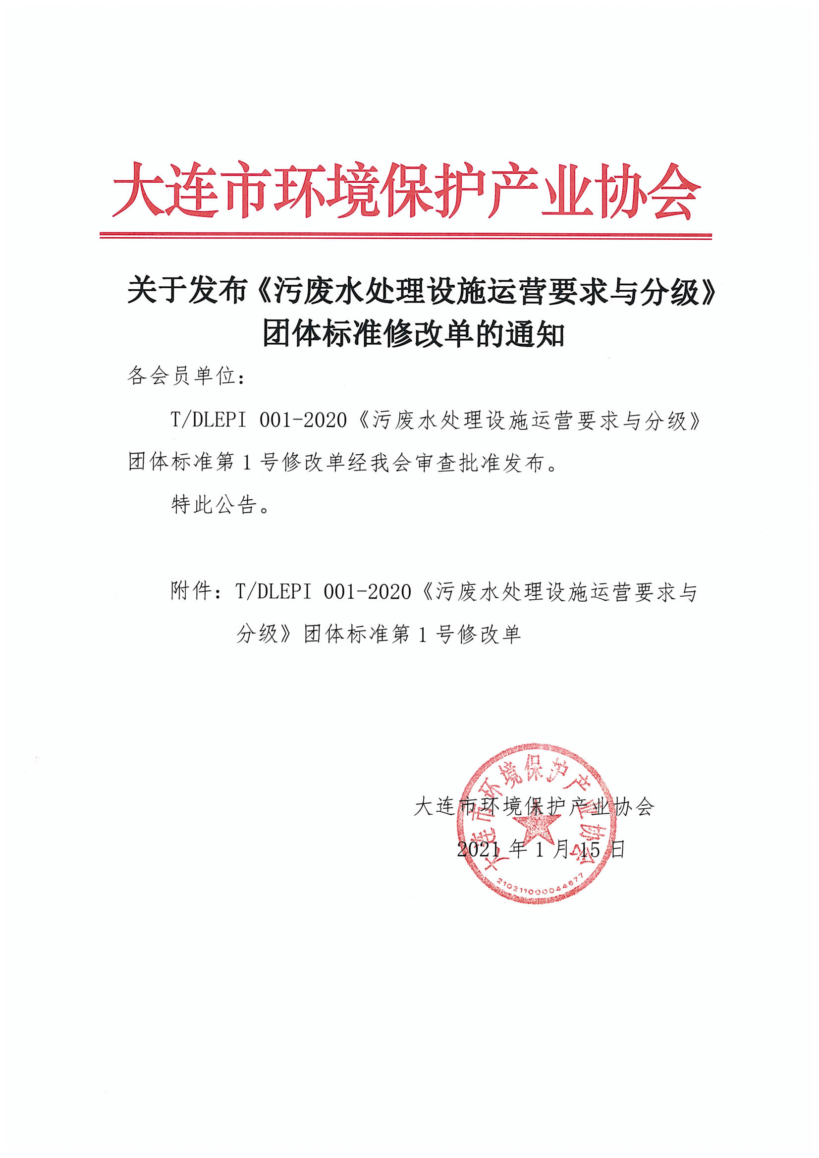 T/DLEPI 001-2020《污废水处理设施运营要求与分级》团体标准第1号修改单经我会审查批准发布。修改单见附件
