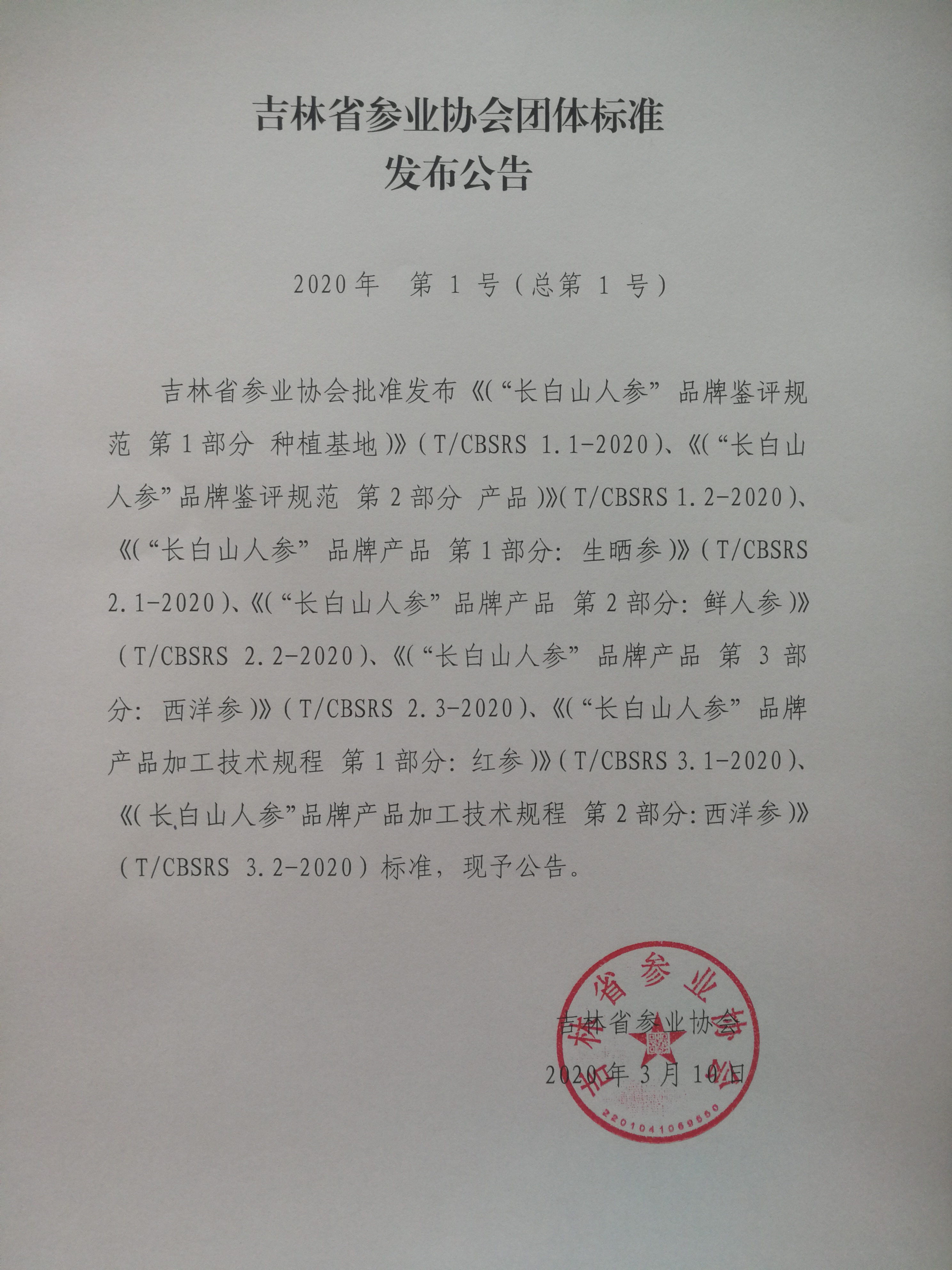 吉林省参业协会批准发布《(“长白山人参”品牌鉴评规范 第1部分 种植基地)》(T/CBSRS 1.1-2020)、《(“长白山人参”品牌鉴评规范 第2部分 产品)》(T/CBSRS 1.2-2020)、《(“长白山人参”品牌产品 第1部分:生晒参)》(T/CBSRS 2.1-2020)、《(“长白山人参”品牌产品 第2部分:鲜人参)》(T/CBSRS 2.2-2020)、《(“长白山人参”品牌产品 第3部分:西洋参)》(T/CBSRS 2.3-2020)、《(“长白山人参”品牌产品加工技术规程 第1部分:红参)》(T/CBSRS 3.1-2020)、《(长白山人参”品牌产品加工技术规程 第2部分:西洋参)》(T/CBSRS 3.2-2020)标准,现予公告。