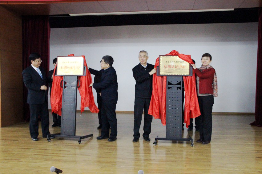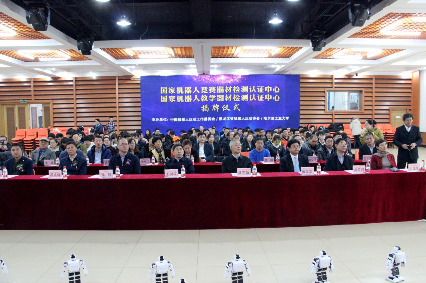 黑龙江省政协主席、黑龙江省机器人运动协会名誉主席杜宇新和哈尔滨工业大学副校长丁雪梅为国家机器人竞赛器材检测中心揭牌;哈尔滨工业大学党委书记王树权和中国机器人运动工作委员会副主任、全国学校体育联盟机器人工作委员会副主席张学军为国家机器人教学器材检测认证中心揭牌。