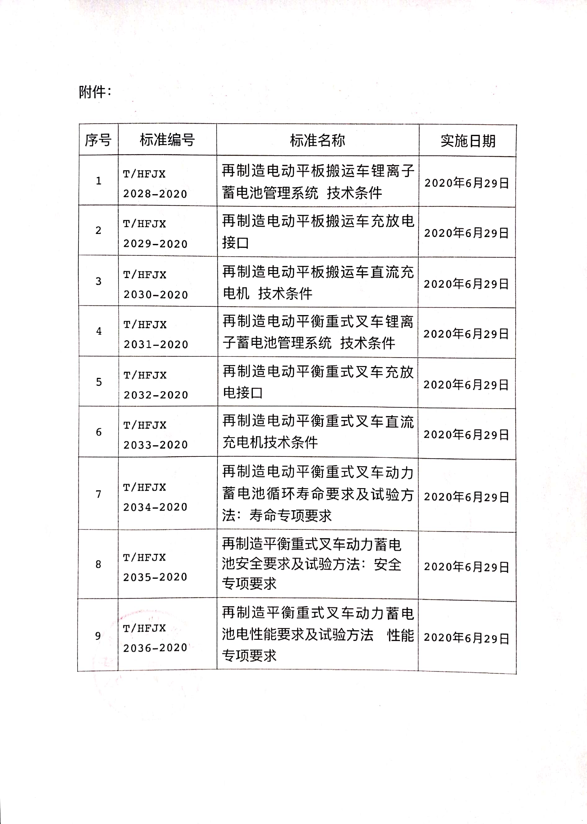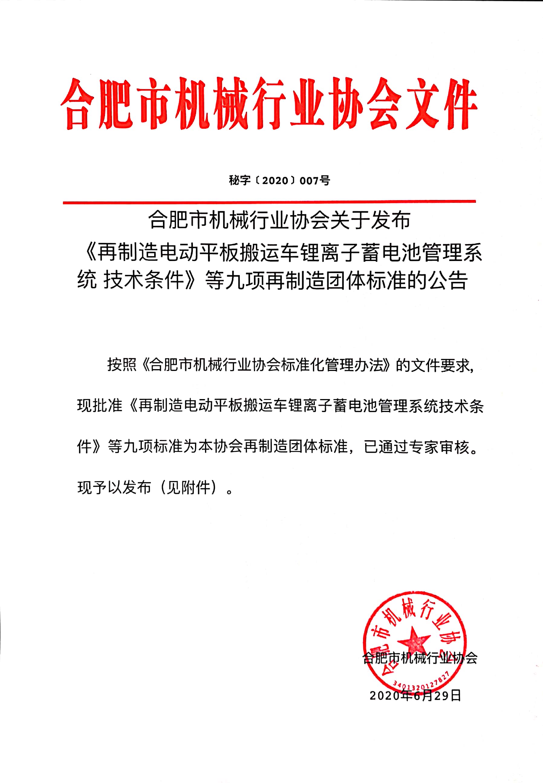 按照《合肥市机械行业协会标准化管理办法》的文件要求,现批准《再制造电动平板搬运车锂离子蓄电池管理系统技术条件》等九项标准为本协会再制造团体标准,已通过专家审核。现予以发布(见附件)。