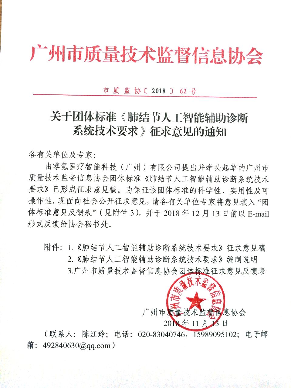 近日,由零氪医疗智能科技(广州)有限公司、腾讯互联网加(深圳)有限公司、华南理工大学、广东省医疗器械研究所、广州生物工程中心、暨南大学、中山大学附属肿瘤医院、广东省人民医院、南方医科大学南方医院、广东省医疗器械质量监督检验所、天津医科大学肿瘤医院、东南大学附属中大医院、北京推想科技有限公司、深圳市宜远智能科技有限公司、杭州依图医疗技术有限公司、广州智慧医疗产学研创新联盟共同完成了广州市质量技术监督信息协会团体标准《肺结节人工智能辅助诊断系统技术要求》(征求意见稿),为保证这一规范的科学性、实用性及可操作性,请贵单位专家对本标准的征求意见稿及编制说明提出宝贵的意见,并将意见反馈表于2018年12月13日前邮件反馈回协会秘书处。