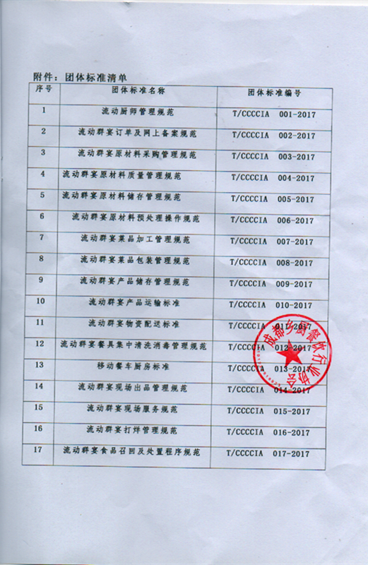 成都乡厨餐饮行业协会批准《流动厨师管理规范》(编号:T/CCCCIA 001-2017)等17项标准为团体标准,于2017年8月1日起正式实施。
