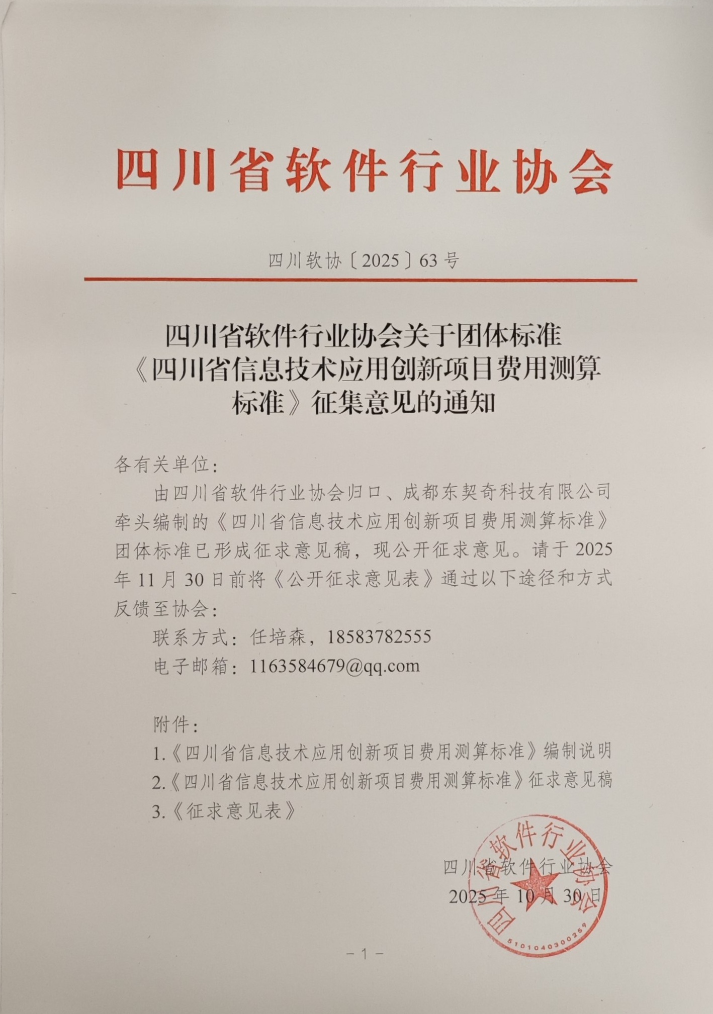 各有关单位:由四川省软件行业协会归口、成都东契奇科技有限公司牵头编制的《四川省信息技术应用创新项目费用测算标准》团体标准已形成征求意见稿,现公开征求意见。请于2025年11月30日前将《公开征求意见表》通过以下途径和方式反馈至协会:联系方式:任培森,18583782555电子邮箱:1163584679@qq.com