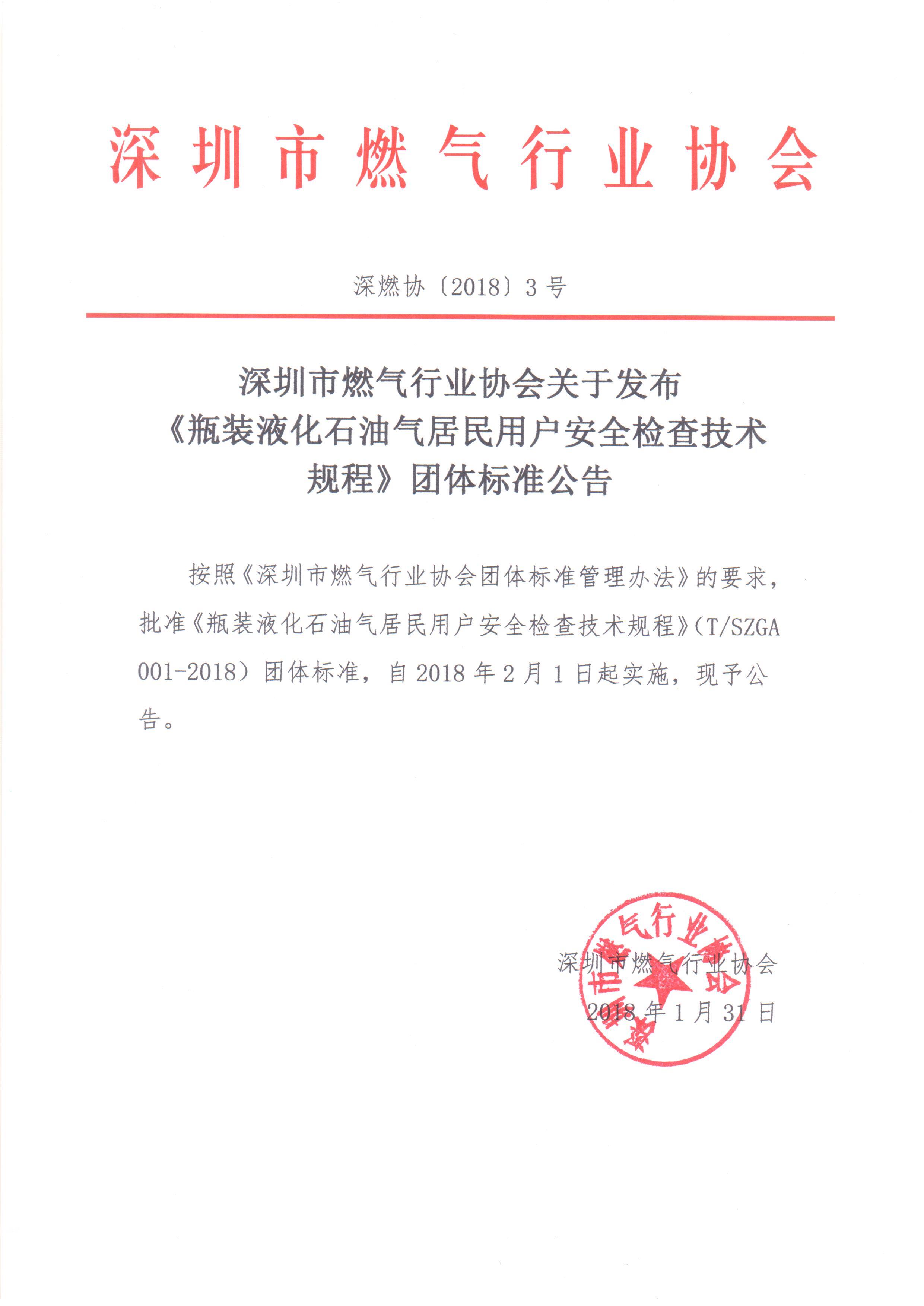按照《深圳市燃气行业协会团体标准管理办法》的要求,批准《瓶装液化石油气居民用户安全检查技术规程》(T/SZGA 001-2018)团体标准,自2018年2月1日起实施,现予公告。