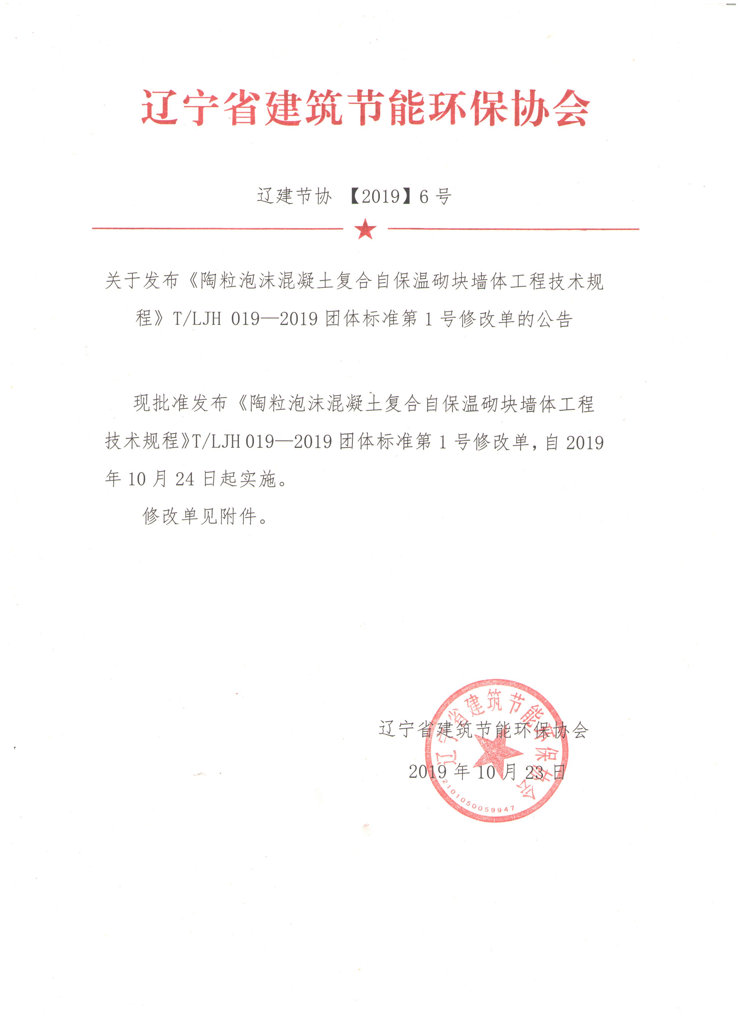 T/LJH 019-2019《陶粒泡沫混凝土复合自保温砌块墙体工程技术规程》团体标准第1号修改单经我团体审查批准发布。建议该修改单于2019年10月24日起实施。 修改单见附件。