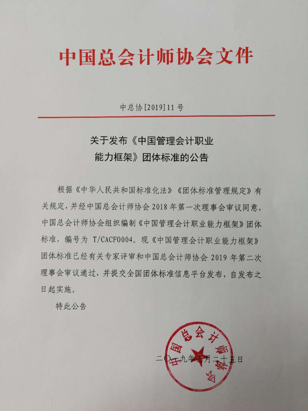 根据《中华人民共和国标准化法》《团体标准管理规定》有关规定,并经中国总会计师协会2018年第一次理事会审议同意,中国总会计师协会组织编制《中国管理会计职业能力框架》团体标准,编号为T/CACFO004-2019。现《中国管理会计职业能力框架》团体标准已经有关专家评审和中国总会计师协会2019年第二次理事会审议通过,并提交全国团体标准信息平台发布,自发布之日起实施。