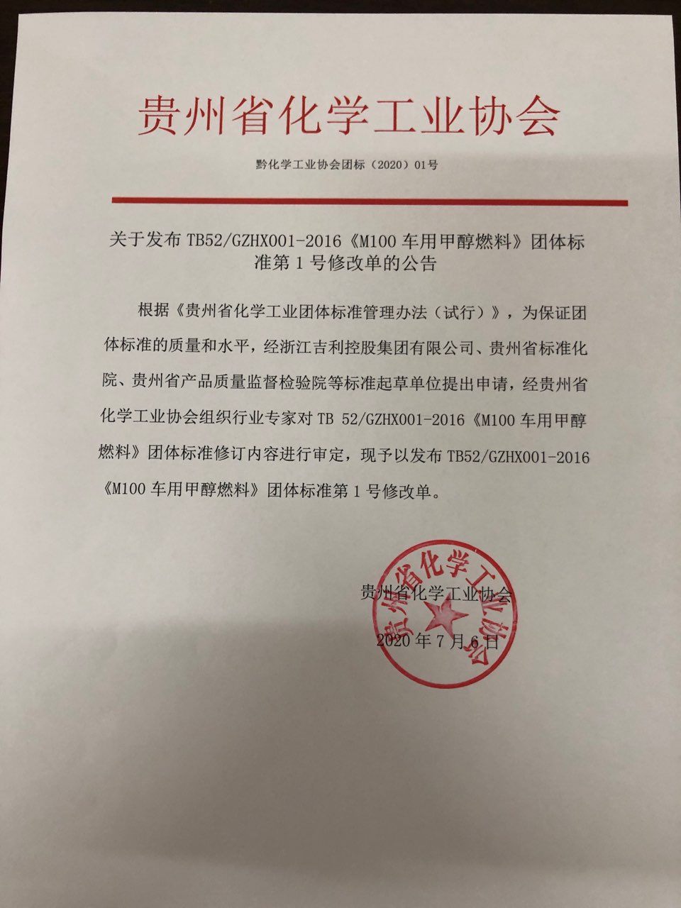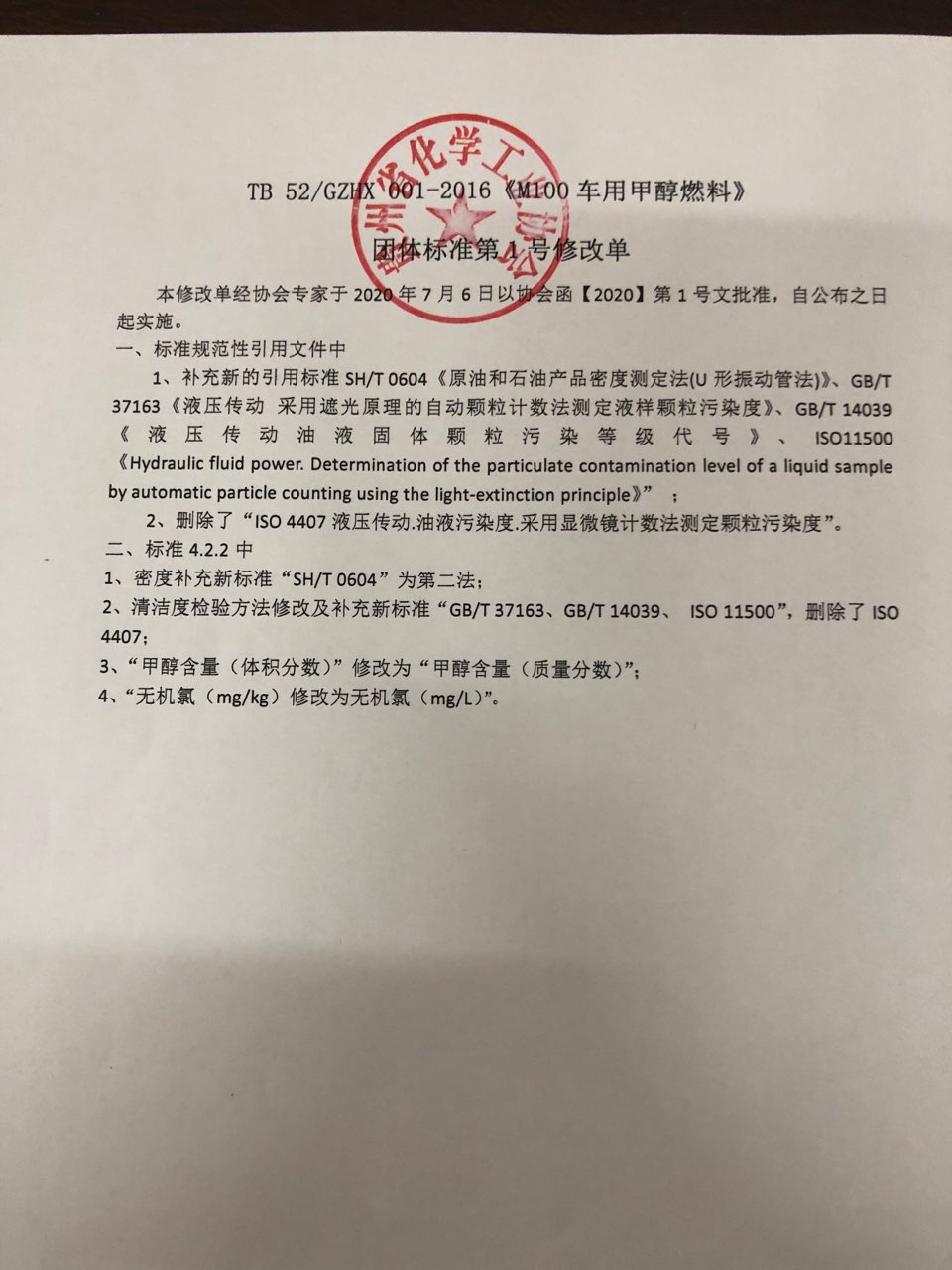 根据《贵州省化学工业团体标准管理办法(试行)》,为保证团体标准的质量和水平,经浙江吉利控股集团有限公司、贵州省标准化院、贵州省产品质量监督检验院等标准起草单位提出申请,经贵州省化学工业协会组织行业专家对TB 52/GZHX001-2016《M100车用甲醇燃料》团体标准修订内容进行审定,现予以发布TB52/GZHX001-2016《M100车用甲醇燃料》团体标准第1号修改单。