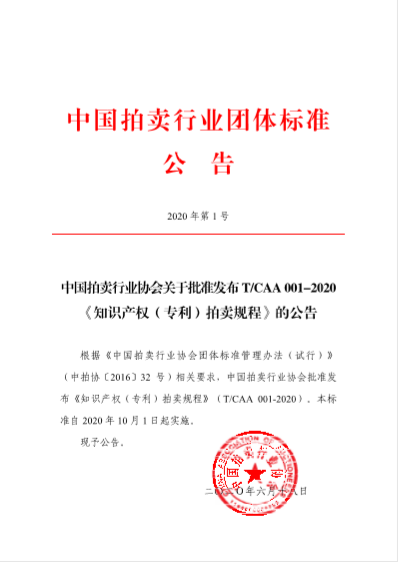根据《中国拍卖行业协会团体标准管理办法(试行)》相关要求,中国拍卖行业协会批准发布《知识产权(专利)拍卖规程》(T/CAA 001-2020)。本标准自2020年10月1日起实施。