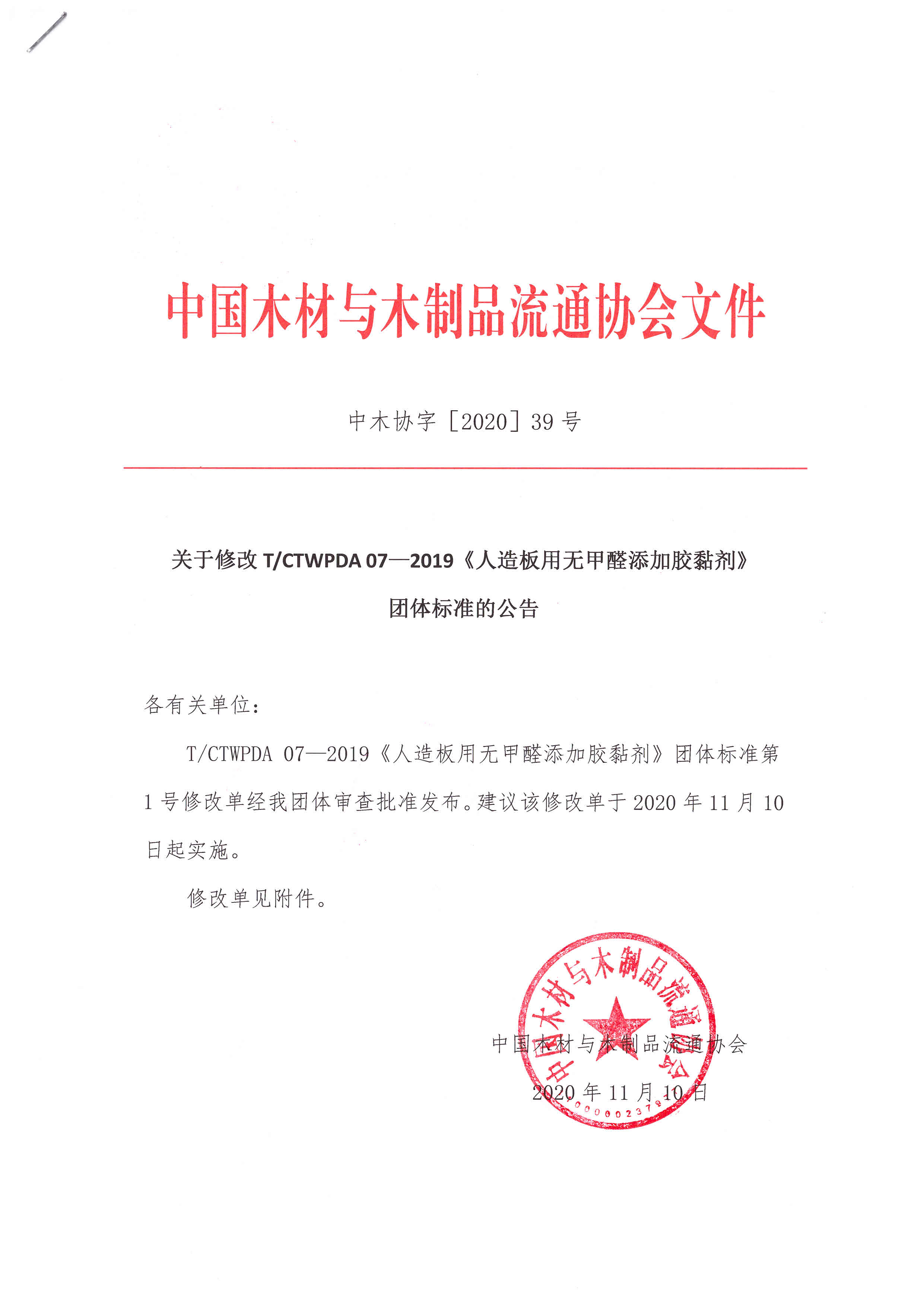 T/CTWPDA 07—2019《人造板用无甲醛添加胶黏剂》团体标准第1号修改单经我团体审查批准发布。建议该修改单于2020年11月10日起实施。
