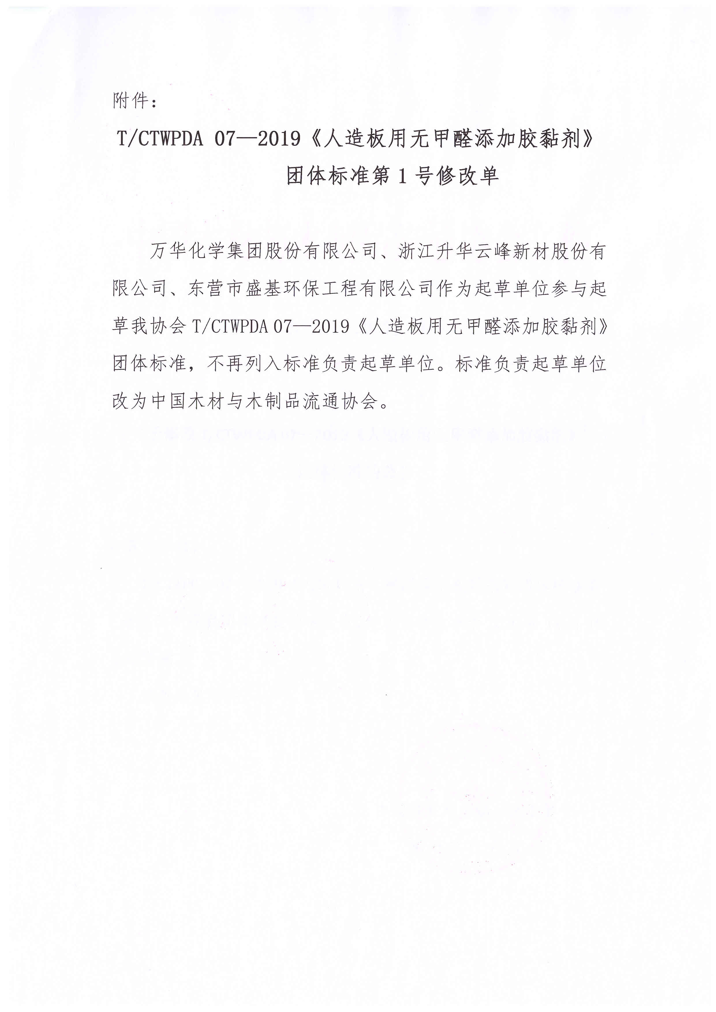 1.关于修改T/CTWPDA 07—2019《人造板用无甲醛添加胶黏剂》团体标准的公告