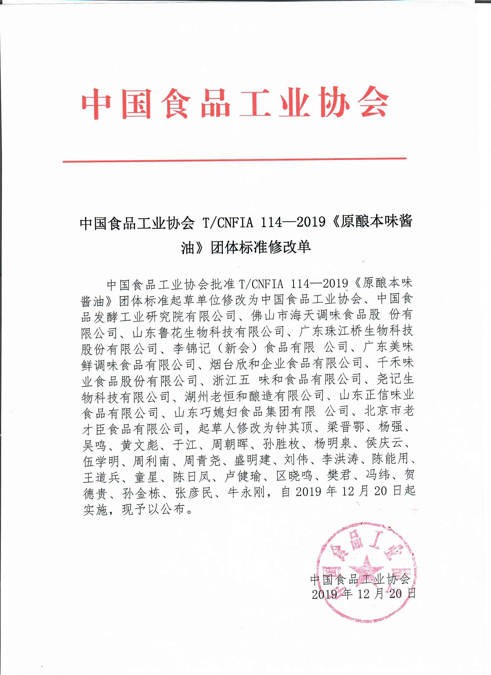 T/CNFIA 114—2019《原酿本味酱油》团体标准第1号修改单经我团体审查批准发布。建议该修改单于2019年12月20日起实施。